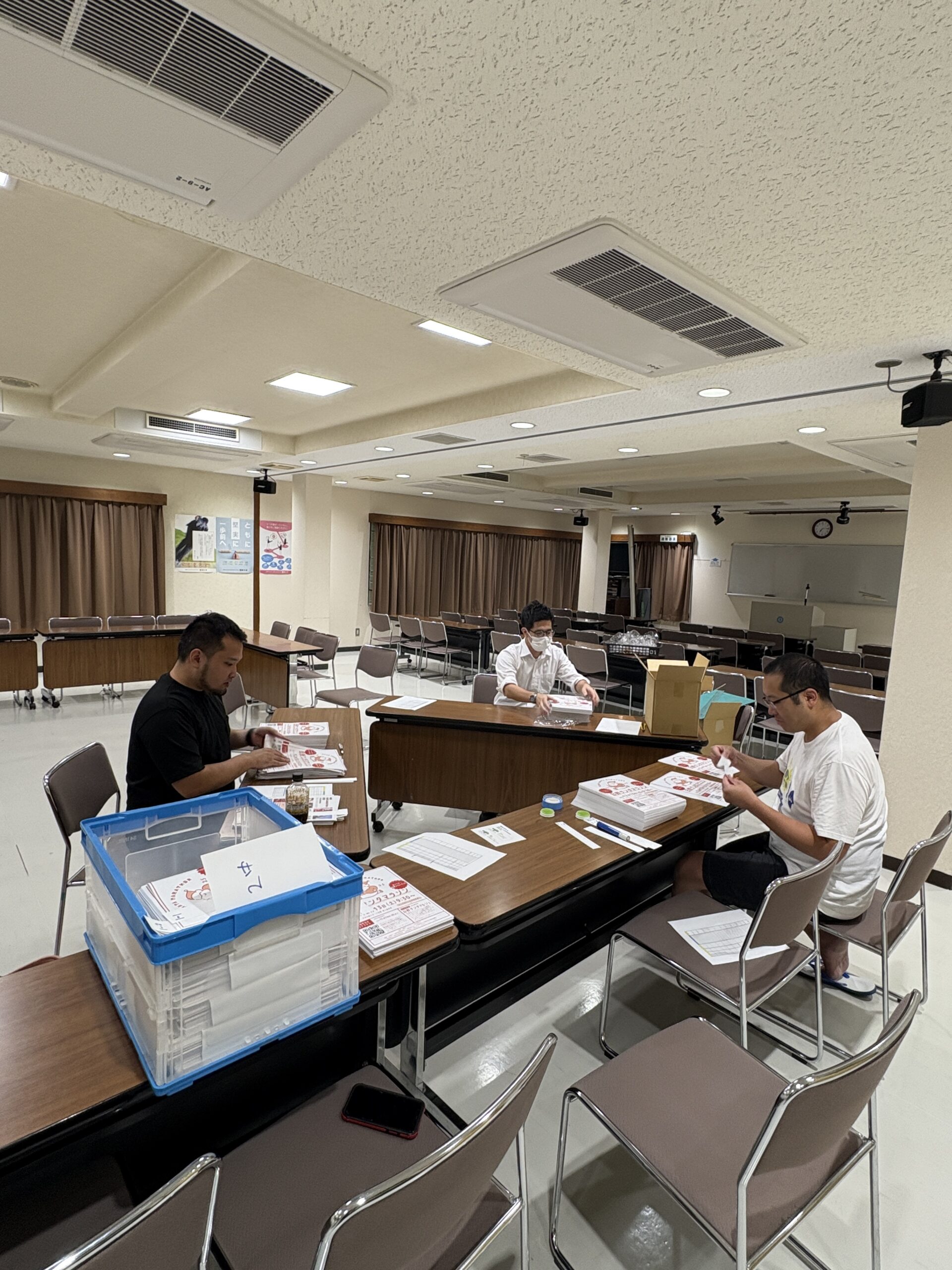 日野市商工会青年部のメンバーが昨年のデータを一部加工してデザインしてくれまして、商工会館で仕分け作業、前日の呼びかけにも関わらず4人体制で仕分け。15,000部ほどある小中学校宛のチラシを各クラスごとの人数に仕分けてくれました。