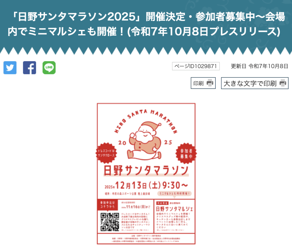 本日、日野市から公式に日野サンタマラソン開催におけるプレスリリースが配信されました。 日野市の文化スポーツ課のみなさま、広報課のみなさま、サポートいただいたみなさま、ありがとうございます。 ただのプレスリリース1つと思われるかもしれません... -